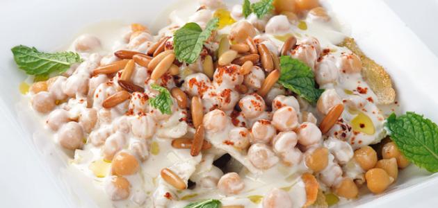 - نضع خليط الخبز والحمص في وعاء عميق ثم نوزع الصلصة على الوجه.