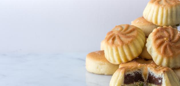 • إكمال تشكيل باقي العجين باستخدام حشوتي التمر والفستق، ثمّ رص الأقراص بشكل متباعد في صينية الخبيز.