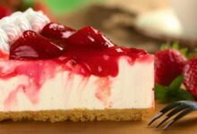 - خفق الجبنة مع علبة القشطة، والسكر، والفانيلا، ثمّ إضافة مزيج الجلي بعد أن يبرد وإعادة الخلط مجدداً.
