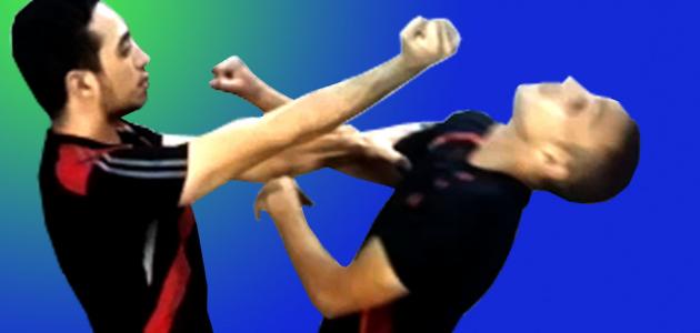 • التمرين الخامس:عندما يدفعُك الخصمُ بعنفٍ باتجاه حائط ويضغط على رقبتك بيديه، هنا عليك الإمساك بيديْه بقوّة لتقاومه وتبعده عن عنقك، وغيّر اتجاهَك بشكلٍ مفاجئ، واركله بين ساقيْه بمشطِ قدمك اليمنى، حتّى يُفلّت رقبتك.
