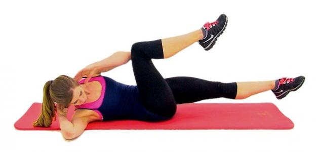 - تحريك الركبة اليمين باتجاه الصدر، مع تقريب الكتف اليسار إلى الأمام.