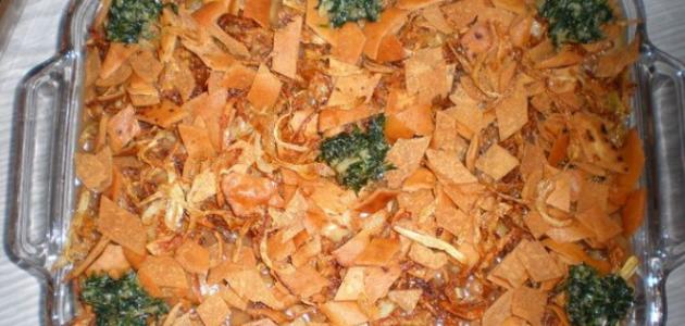 • املئي مقلاة عميقة من زيت الذرة حتى تستطيعي قلي قطع الخبز الصغيرة، وبعد أن يتم قلي الخبز، ويتحول لونه إلى اللون الذهبي، أخرجيه من الزيت، واتركيه ليتم تصفيته جيداً.