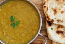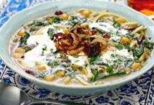 • اسكبيهم في وعاء التقديم وزيني الطبق بالخبز المقلي والرمان.