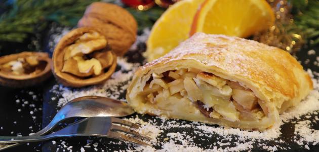 • طوي العجينة، وفردها ست مرات، مع مراعاة إدخالها إلى البراد حتى ترتاح وتبرد بين كل مرتين تقريباً، أو حسب الحاجة.