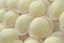- نرفع الجزر عن النار، ونتركه حتى يبرد قليلاً ثم نكوره إلى دوائر صغيرة ونضع عليه جوز الهند.