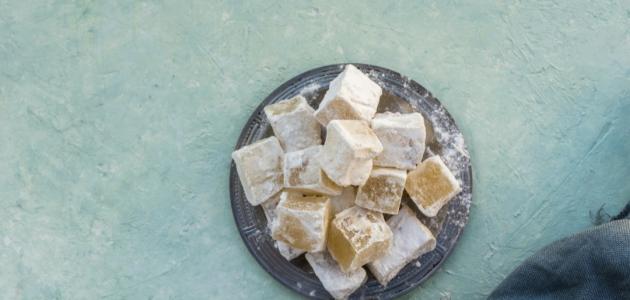 - حشي راحة الحلقوم بالقشطة وترتيبها في طبق تقديم مناسب، وتزيين حبات الحلقوم المحشوة بالفستق الحلبي والزهور.