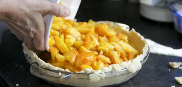 - تقشير حبات التفاح وتقطيعها على شكل شرائح سميكة، ثمّ وضعها في وعاء ورشّها بالقرفة، والسكر، ومقدار ملعقتين من الدقيق.
