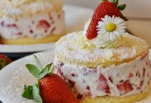 • ترتيب قطع البف باستري المخبوزة في طبق التقديم ووضع مقدار ملعقة صغيرة من القشطة في وسط كل قطعة من قطع البف باستري.