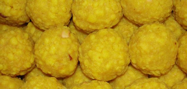• أخذ كمية من خليط كرات العجينة بحجم حبة البيض تقريباً أو حسب الحجم الرغوب به وتشكيله بين باطن الكف إلى كرة متماسكة للحصول على حلو اللدو.