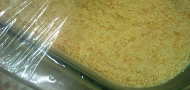 • نغمس كمية من البسكويت في الماء الدافئ والمذاب فيه نسكافيه، ونفرد طبقتين منه فوق الطبقة الأولى.