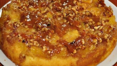 - نُخرج الصينية من الفرن، ثمّ نسكب القطر الساخن على الحلى.