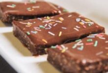 - عند التقديم، نزيّن الحلى بمبروش الشوكولاتة، ثم نقطّعها، ونقدّمها.