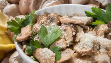 • لتحضير الصلصة، نَخلط اللبن الزبادي مع المايونيز جيّداً، ثمّ نُضيق الثوم مع التقليب المستمر.