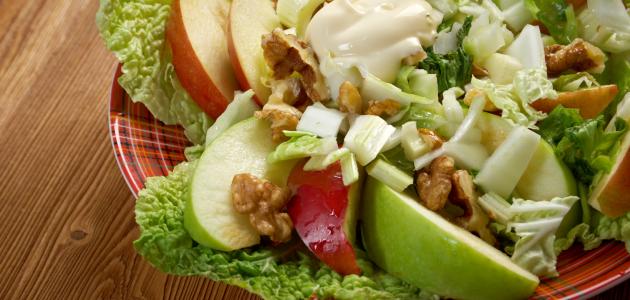 • نخلط شرائح خس الأيسبرغ، مع شرائح التفاح، والجوز، وجبن البارميزان في وعاء كبير.