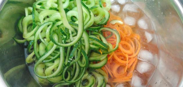 - قطّعي الخيار والجزرعلى شكل قطع طوليّة، واتركيها جانباً.