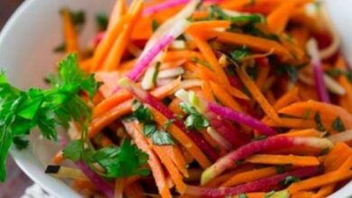 - خلط المزيج بملعقة من زيت الزيتون والخل والليمون والصنوبر.