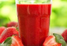 - سكب سموثي الفراولة في كاسات التقديم، وتزيينها بقطع الفراولة.