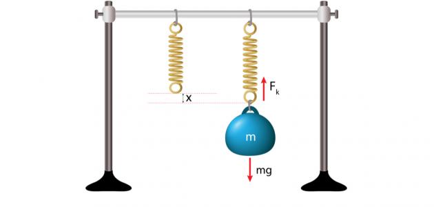 • كتابة معادلة قانون هوك، القوة = ثابت المرونة × إزاحة النابض؛ وبالرموز، ق= ث × ف