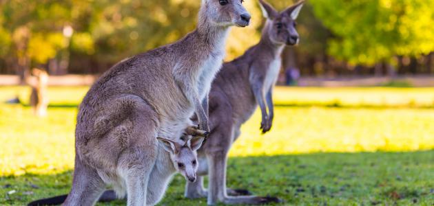 • الكنغر الشرقي الرمادي المتميز بأنّه طويل الرجلين، ويعيش في الجهة الشرقية من أستراليا في المناطق الخصبة.