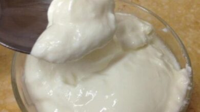 • نضع نصف ملعقة صغيرة من لبن الزبادي في طبق عميق، ثمّ نضيف إليه ملعقتين من الحليب الساخن، ثمّ نحرك المكوّنات حتى تتجانس، ثمّ نضعها جانباً.