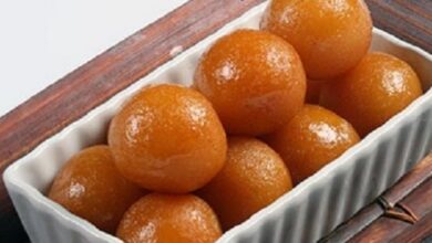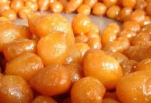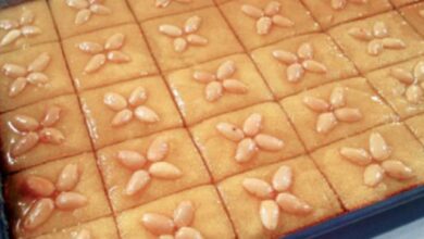 - تعاد إلى الفرن لمدة ربع ساعة تقريباً، ثُم تخرج وتشرّب فوراً بالقطر الدافىء.