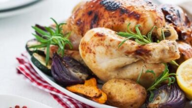 - إدخال الطبق في الفرن لمدة ثلاثون دقيقة إلى أن تنضج الخضروات ويصبح لون السطح مائل إلى ذهبي اللون، ثمّ تقديمه مباشرة.