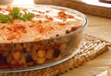 • نضع الخليط فوق التوست في الصينيّة، ثمّ نرتّب فوقه طبقة جديدة من الخبز.