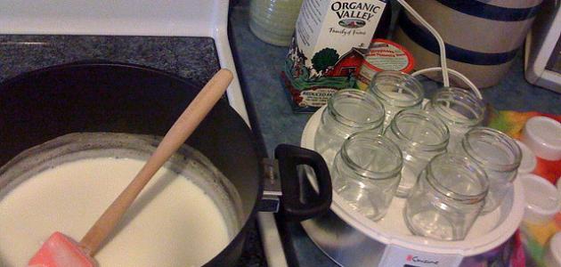 - أحضر قدراً مناسباً لغلي الحليب فيه، بحيث يكون قدراً مطلياً وغير مصنوع من الألمنيوم أو الستانلس ستيل حتى لا يتفاعل اللبن معه، وضع فيه الحليب حتى يغلي، واتركه ليبرد قليلاً بحيث يتحمل الإصبع درجة حرارته.
