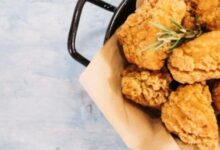 - يقدم الدجاج مع الخلطة إلى جانب طبق من البطاطا المقلية وصلصة المايونيز والكاتشاب.