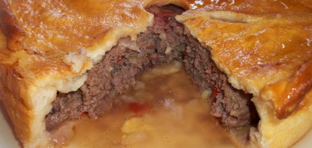 • تقسيم العجينة إلى جزأين، وفرد الجزء الأول في قاع صينية دائرية وسكب حشوة اللحمة على العجينة، وتوزيعها بشكل متساوٍ.