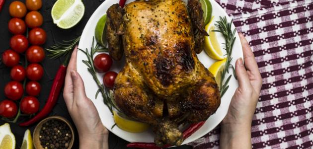 - يتمّ وضع الدجاج في صينيّة مدهونة بالزيت، ونغطّيها بورق الألمنيوم، ونتركها في الفرن على درجة حرارة 200 مئويّة حتى تنضج، ثمّ ننزع الألمنيوم ونتركها حتّى تتحمّر.