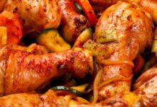 - نضع الدجاج في صينية فرن، ثمّ ندخلها إلى الفرن المسخن مسبقاً على الرف العلوي حتى تنضج وتتحمّر.