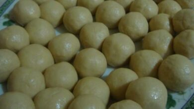 - نغلق العجينة، ونكوّرها، ونغمسها بالفستق.