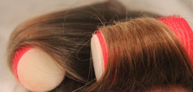 • نُخرج خُصلةٍ بسمك سنتمترين من القسم الخلفي الأوسط، نُمشط الخُصلة جيداً، وندهنها قليلاً بالكريم المثبت، ثمّ نلفها باللفافة ذاتِ الحجمِ الكبير، ونُثبتها بالبنس.