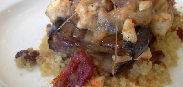 • خمسة رؤوس من الباذنجان مُتوسّطة الحجم ومُقشّرة ومُقطّعة لشرائحَ رفيعةٍ ومُحمّرة بالزّيت.