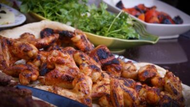 • نُقدّم قطع اللحم المشوي مع السلطة واللبن.