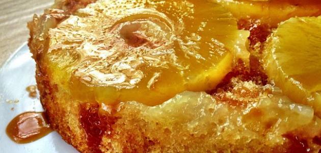 - حال إخراج الكيكة من الفرن نقوم بقلبها وإخراجها من القالب منعاً وتجنباً لالتصاقها، بحيث يكون الأناناس للأعلى.