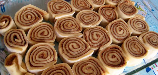 - لف العجينة على شكل رول كبير ومن ثم تقطيعه إلى لفائف صغيرة. ترتيب القطع في صينية الخبز.