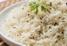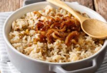- نضيف الأرز المسلوق، وقليلاً من الزيت النباتي، وقليلاً من صلصة الصويا، ونحرّك جيّداً.