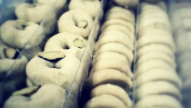 - لف العجينة على الحشو من أجل الحصول على لفافة متناسقة وتثبيت الأطراف، ثم مسك طرفي اللفافة ولصقهما ببعضهما لتشكيل حلقة، وتثبيت طرفيها جيداً.