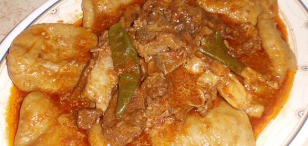 - نأخذ قطعةً من العجينة ونصنع حفرةً بوسطها بإبهام اليد، ثم نملؤها باللحم وبعدها نغمسها بمرق اللحم ثم نأكلها.