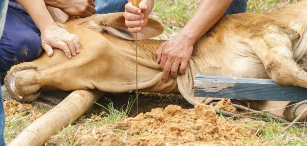 - أمّا الإبل؛ فتُذبح عن طريق النَّحر، والنَّحر هو الطَّعن بأداة الذَّبح الحادّة في اللُّبة- وهي المنطقة بين العُنق والصَّدر في الإبل ويُطلق عليها اسم الوهدة-.