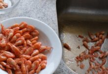 - نوزع خليط الخضروات وخليط البهارات في جوف السمك مع الضغط بقوة حتى تمتلئ جيداً.