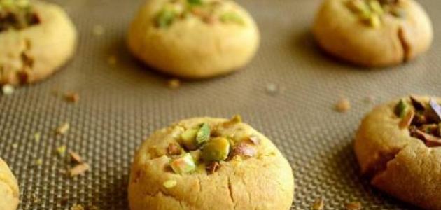 - نشكل العجين على شكل أقراص مستديرة بحجمٍ صغير، ثمّ نضع في منتصف كل قرص قطعة أو حبة من الفستق الحلبي، ونضغط عليها قليلاً نحو الأسفل بحيث تلتصق حبة الفستق بالعجين.