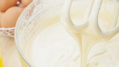 - نخفق السمن جيداً في وعاء، ثمّ نضيف إليه زلال البيض، والفانيلا، والسكر مع مرعاة الخفق بشكل مستمر.