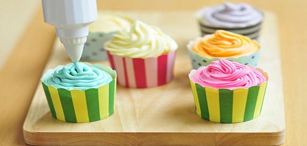 • وضع الكريمة في كيس الحلواني وحفظها في الثلاجة لتبرد ويسهل العمل بها، ثمّ تزيين الكب كيك، ويمكنك كذلك إضافة ملون طعام باللون المفضل لديك.