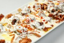 - زيّني وجه الطبق بحبات الصنوبر المحمّصة، بعدها يكون الطبق جاهزاً للتقديم إلى جانب اللبن الرائب.