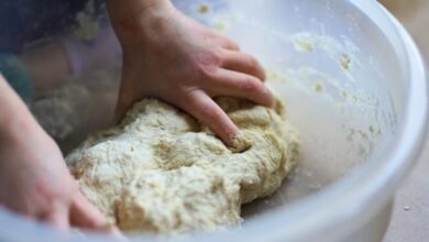 - نضع الحليب في إناء، ونضيف إليه السكر، والخميرة، والملح، ونخلطها جيداً، ثمّ نضيف الماء بشكلٍ تدريجي، ونستمر بالخلط.