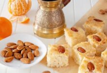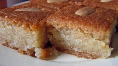 • نقطّع الهريسة إلى مربعات، ونزيّنها باللوز.