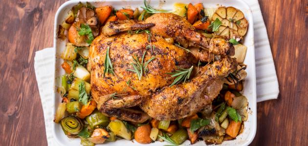 - نضع الدجاجة في صينية، ثمّ ندخلها إلى الفرن مدّة ثلاثين دقيقة تقريباً على نار متوسطة.